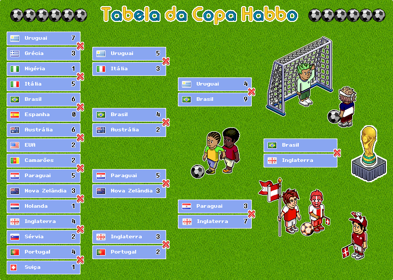 Quem irá levantar a Taça ao lado? Brasil ou Inglaterra? Depois de muitos jogos, gols e risadas, finalmente chegamos ao último jogo da Copa Habbo 2010!